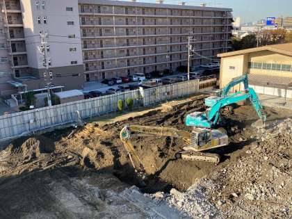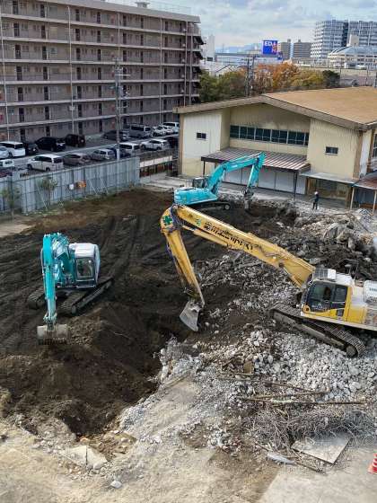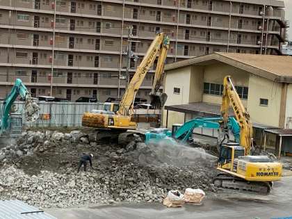地下構造物の掘り出しは続き、地面深くから大きなコンクリートの塊が掘り出されていました。脇には大きめの塊が積み上げられる端から、かみ砕く作業が続きます。連日ダンプカーでの運び出しも行われています。
