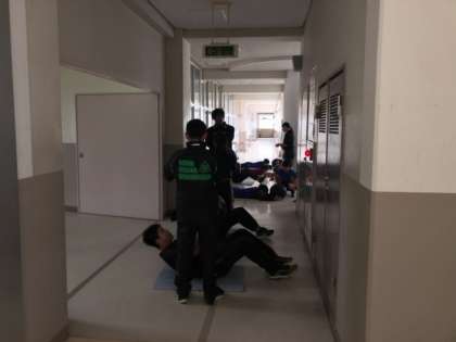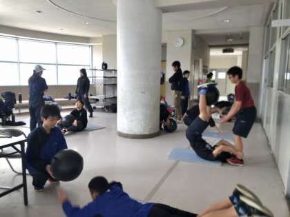 陸上部の練習の様子です。校舎内の廊下でボールを使ったトレーニングを行なっています。