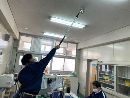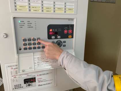 自動火災報知設備の点検では、熱感知器が正常に作動するか、全部の部屋での確認作業です。各部屋の熱感知機に熱源を当てて、火災報知設備の本体と1部屋ごとに連絡を取りながらの確認作業でした。