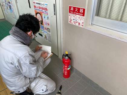 消火器に使用期限切れ等の不備がないか、1本1本確認していく地道な作業もありました。また避難に関する誘導灯等の表示器具の点検もありました。