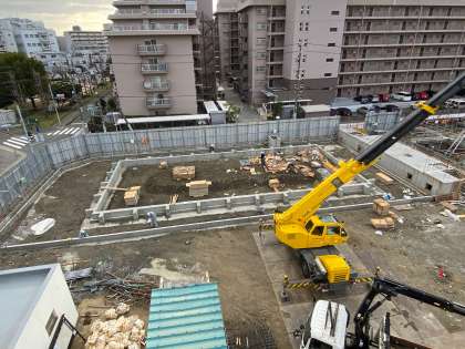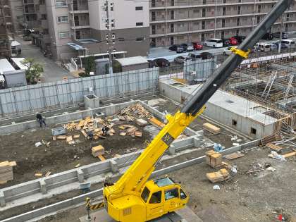 取外された木製の型枠は、クレーン車で吊り下げられて集められています。