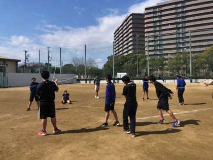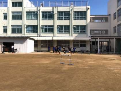 第1グラウンドでは陸上部が練習しています。種目別に分かれて専門競技の練習をしたり、縄跳びを使ってダブルダッチのトレーニングも行っています。