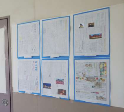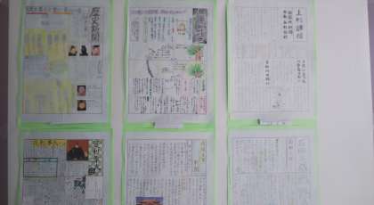 1年生の冬休みの社会科の宿題で取り組んだ『歴史新聞』を展示しています。書籍やインターネットを使って調べたことをくふうしてまとめています。イラストや、年表などもうまく取り入れています。