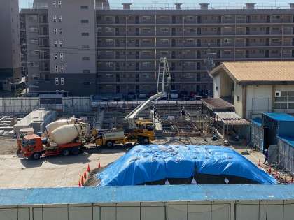 2月5日に挌技室の基礎となる部分の型枠に、コンクリート打設が行われていました。大型ポンプ車の受け口に、コンクリートミキサー車2台が寄り添って生コンを流し込んでいました。ポンプ車の長いチューブから、生コンが勢いよく型枠に打設されていました。