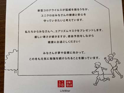 ユニクロは新型コロナウイルス感染症対策の取組として、昨年3月より医療機関や介護施設などに日本を含む多くの国々で、衣料品提供などの支援をされてこられました。この度子供たちの感染予防しながら学び続けることができるように、全国の小中高校の児童・生徒と教職員を対象に「エアリズムマスク」100万パック(1パック3枚入り)を寄贈するとのことでした。早速本校も応募しましたら、先日全員分が送付されてきました。