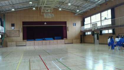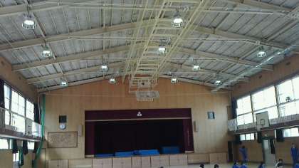 ・バスケットゴール(体育館入口側)がモーターの故障のため上方移動ができませんでした。今回新規の電動モーターに交換しました。同時にリモコンでバスケットゴールが動くようになりました。(体育館入口側のみ)