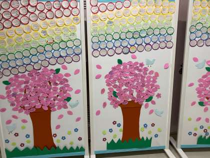 7号館2階の図書室前のボードのさくらです。1・2年生徒が一人一人、3年生に向けて気持ちを込めたメッセージを色画用紙に書いて、貼った桜の大木です。