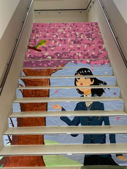美術部は、卒業生にお祝いとお礼の気持ちをこめて階段アートを作成しました。