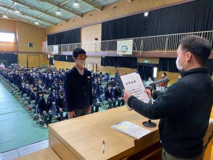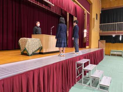 卒業式の当日と同じく、入場から開式・閉式の言葉をへて、花束贈呈まで一通り行いました。「卒業証書授与」では、新型コロナウイルス対応でクラス代表が、卒業証書を受け取る練習もしました。卒業生答辞(下の写真)の練習もありました。