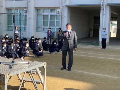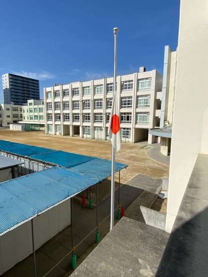 本日の朝「3年生を送る会」の前に、教頭先生から全校生徒に向けて追悼のお話がありました。本校の国旗も本日は半旗を掲げさせていただきました。