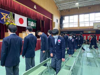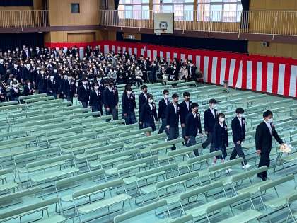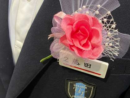 体育館では在校生、保護者、教職員入場後、卒業生が大きな拍手で迎えられて入場してきて、担任の先生の合図で着席しました。 昨日在校生からいただいたコサージュが胸元を飾っていました。