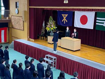 式典時の舞台周りの様子は、保護者の皆様に詳しく見てもらうことができません。担任の先生による、生徒氏名の読み上げ時の写真を掲載してみました。