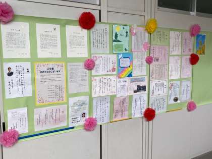 1号館1階廊下の印刷室壁面に、複数枚の模造紙にたくさんの祝辞がありました。