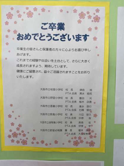 大阪市長、大阪市議会議長、教育委員会教育長、国会議員、府会議員、西淀川区長、校区5小学校の校長先生・野里幼稚園の園長先生・PTA会長連盟で、御幣島幼稚園の祝辞もありました。高等学校からもたくさんいただきました。