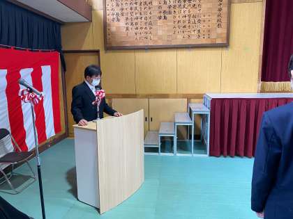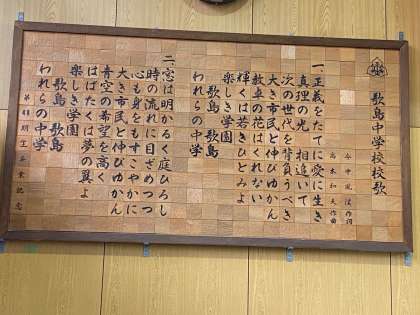 会場全体の様子と司会者後方に掲げてある「歌島中学校校歌」の写真です。