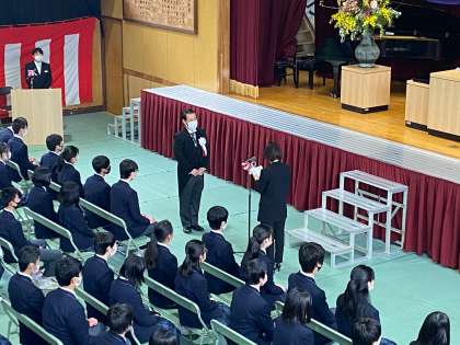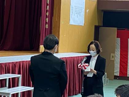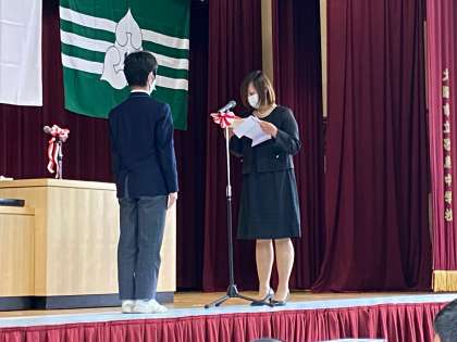 閉式ののことばに続いて、舞台上でPTA副会長より生徒代表に記念品が贈られました。