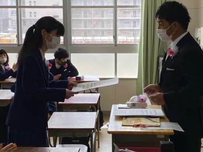 生徒達は体育館退場後、各クラスへ戻って最後の学活です。