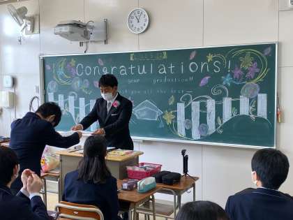 卒業式にむけて、1、2年生が3年生の各教室に黒板アートを描きました。1組から4組は2年生が、5組から7組は1年生が担当しました。