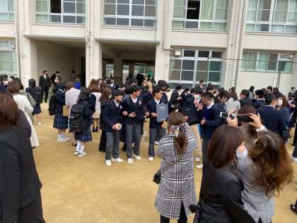 学活終了後グラウンド全面に広がって、保護者と生徒が写真撮影等でひと時を過ごしていました。生徒と保護者とが余韻にひたり、にこやかないい表情でスナップに収まっていました。