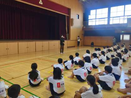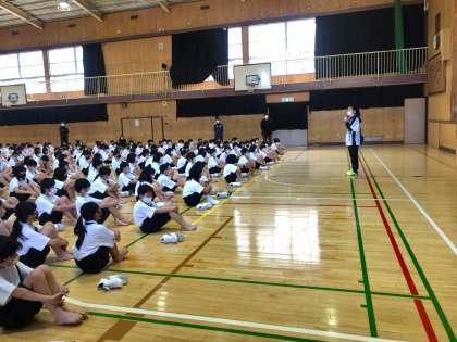 身体測定のあと、1年生は学年集会を行いました。学年の先生の紹介があり、これからはじまる部活動や教科のお話などがありました。