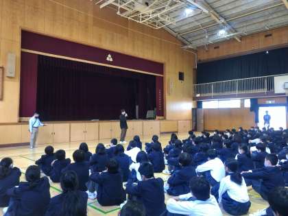 本日、1年生の学年集会を行いました。クラスで静かに移動し、整列することができました。服装チェックでは、ベルトや名札の付け忘れが少しありました。気をつけるようにしましょう。