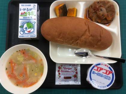 パン、牛乳、煮こみハンバーグ、コーンスープ、焼きかぼちゃ、ヨーグルト、いちごジャム