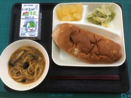 パン、牛乳、カレースープスパゲッティ、キャベツのピクルス、りんご(カット缶)