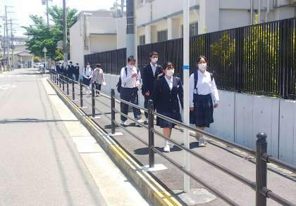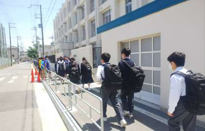 大型連休明けの、5月6日の登校のようす、予鈴15分前です。連休疲れもほとんどなく、元気一杯という感じでした。初夏らしくなり、夏服の生徒も増えてきました。