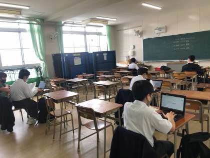 各学年で朝から登校して、学習室などを使ってオンライン学習に取り組んでいます。