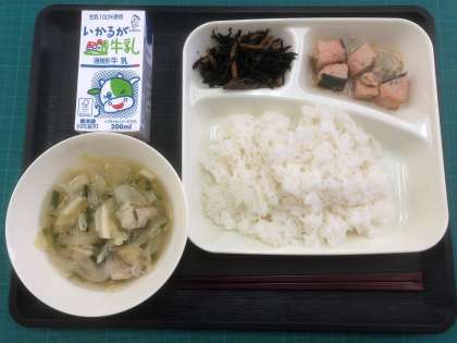 ごはん、牛乳、さけのごまみそ焼き、五目汁、ひじきのいため煮、でした。