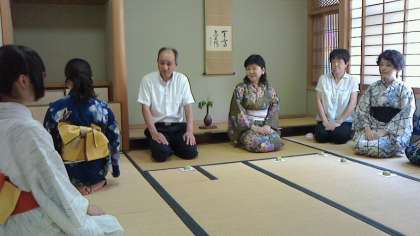 和服を着た茶道部員の、顧問の指導のもと