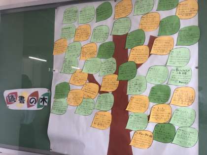 通用門前の掲示板に「読書の木」として、先生たちから生徒のみなさんへのおすすめの本を紹介しています。