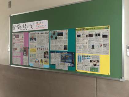 1年生校舎の掲示板に、新聞の切り抜き記事が掲示されています。