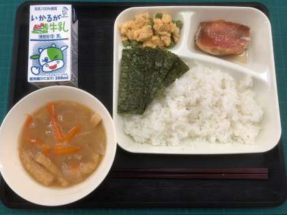 ごはん、牛乳、あかうおのしょうゆだれかけ、みそ汁、えんどうの卵とじ、焼きのり、でした。