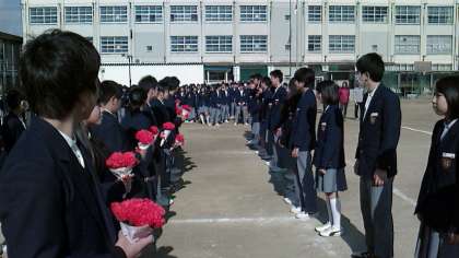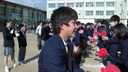 生徒議会メンバーから3年委員長への花束贈呈の場面です。