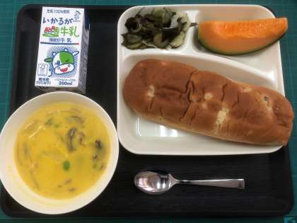 パン、牛乳、かぼちゃのクリームシチュー、ミックス海そうのサラダ、クインシーメロン、でした。