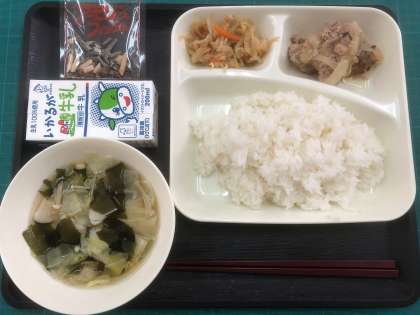 ごはん、牛乳、豚肉の甘辛焼き、すまし汁、切干しだいこんのいため煮、アーモンドフィッシュ(中)、でした。