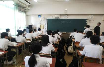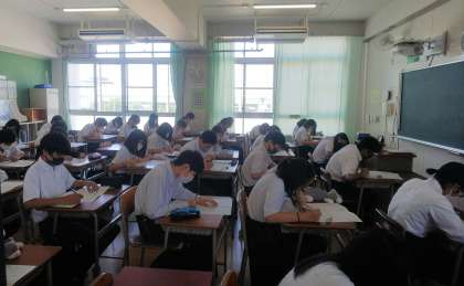 2年生は、10日の6時間目に国語の単元テストを行いました。直前まで、プリントなどで、一生懸命に学習し、読解問題や、漢字の書き取り、敬語の分類などの問題に取り組みました。上の写真は、開始30秒前の3組、下の写真はテスト中の1組のようすです。