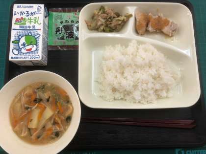 ごはん、牛乳、鶏肉のおろしじょうゆかけ、みそ汁、野菜いため、ソフト黒豆(中)でした。