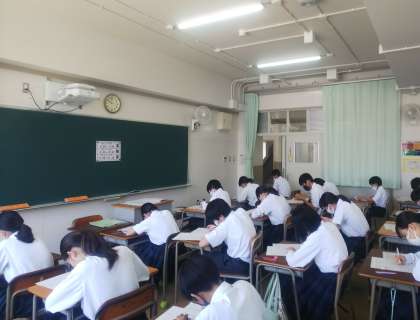 2年生は、英語、数学、音楽のテストに挑みました。これまでに学習した成果を十分に発揮できたでしょうか。あと2日間がんばりましょう。
