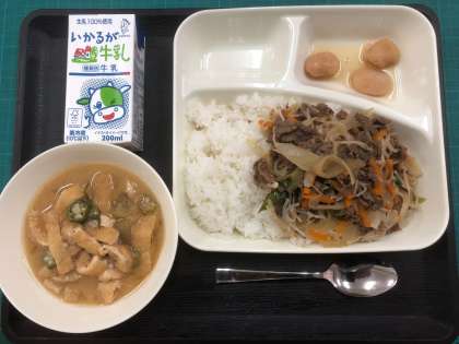 牛乳、牛丼、とがんのみそ汁、白花豆の煮もの、でした。