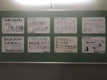 一年生校舎の掲示板に先日の各種委員会で決められた目標が掲示されています。
