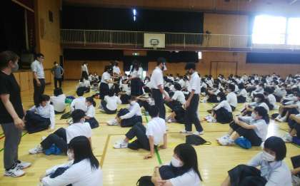その後、生徒たちは、アイマスク体験を行いました。各クラス1名ずつの生徒が、アイマスクをつけて、整列している生徒の間を、前から後ろまで歩いてみました。まっすぐに歩くのがいかに難しいか、声かけをしたクラスメートも感じることができました。