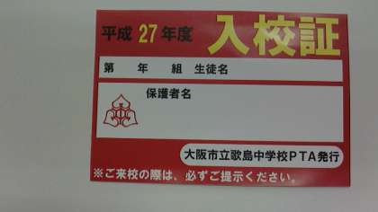PTA会費で平成27年度「入校証」等を購入していただきました。