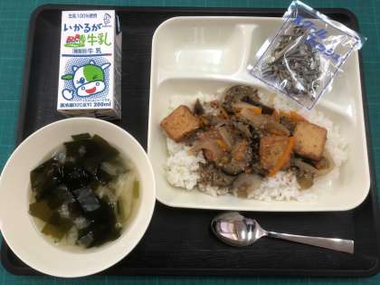 ごはん、牛乳、マーボー厚揚げ丼、中華スープ、ミニフィッシュ、でした。