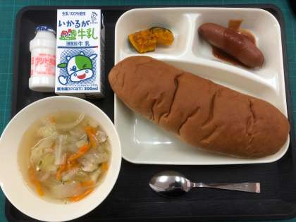 パン、牛乳、フランクフルトのケチャップソース、スープ、焼きかぼちゃ、発酵乳