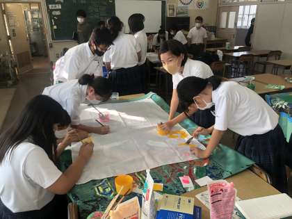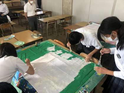 放課後、有志の生徒が集まり、それぞれ考えられた学級旗のデザインを下描きしたり、絵の具で着彩したりしています。