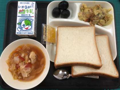 パン、牛乳、豆乳マカロニグラタン、トマトスープ、ぶどう(巨峰)、マーマレード、でした。