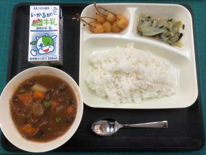 ごはん、牛乳、ハヤシライス、キャベツのひじきドレッシング、さくらんぼ、でした。