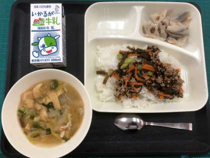 本日のメニューは、ごはん、牛乳、もずくと豚ひき肉のジューシー、さつまいものみそ汁、焼きれんこん、でした。